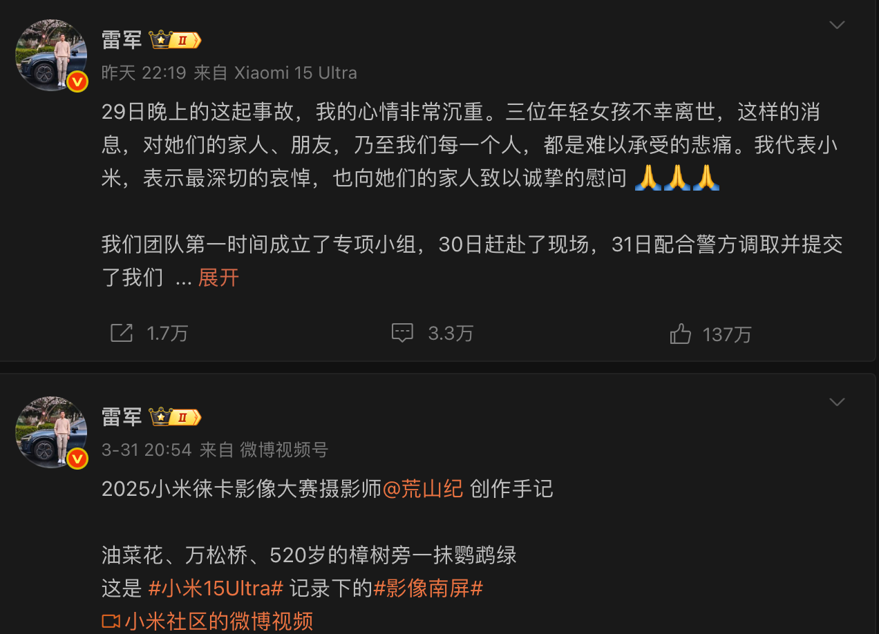 4月1日,距离事故发生超过72小时后,雷军终于在微博发声:“29日晚上的这起事故,我的心情非常沉重。三位年轻女孩不幸离世,这样的消息,对她们的家人、朋友,乃至我们每一个人,都是难以承受的悲痛。我代表小米,表示最深切的哀悼,也向她们的家人致以诚挚的慰问。”