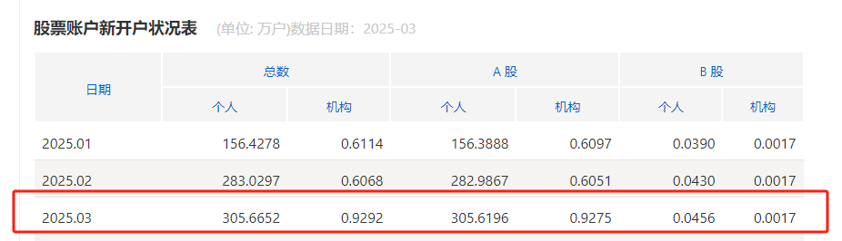 数据显示,今年1月、2月A股新开户数分别为157万户、283.59万户。今年3月306.55万户的A股新增开户数亦较2024年3月241.79万户的A股新开户数同比增长近27%。