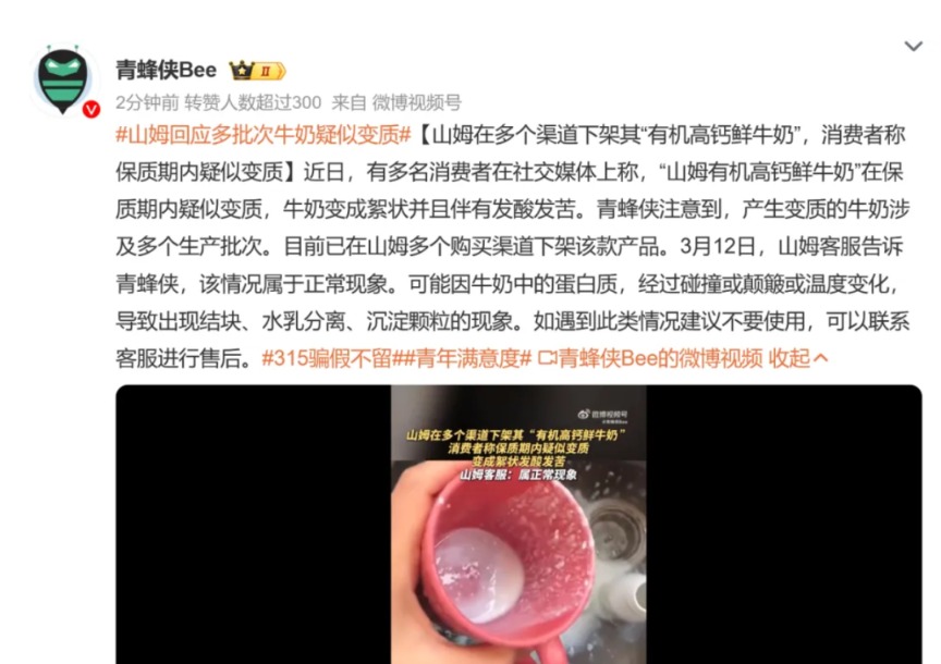 2025年3月,有多名消费者在社交媒体上称“山姆有机高钙鲜牛奶”在保质期内疑似变质,牛奶变成絮状并且伴有发酸发苦。据公开资料不完全梳理,2024年山姆超市曾多次“翻车”,均涉及食品安全问题。