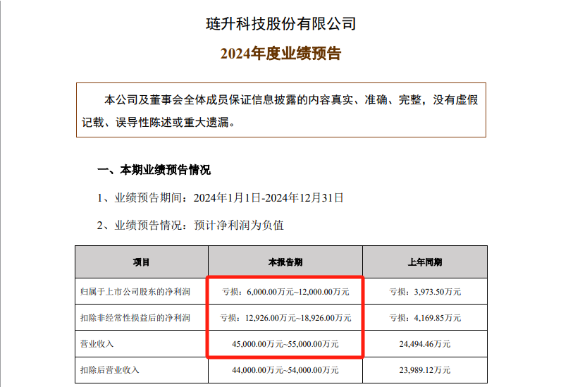 同时,琏升科技预计其2024年的归母净利润亏损6000万元至1.2亿元,扣非后净利润亏损1.29亿元至1.89亿元,两者相比2023年的亏损金额均有所扩大。