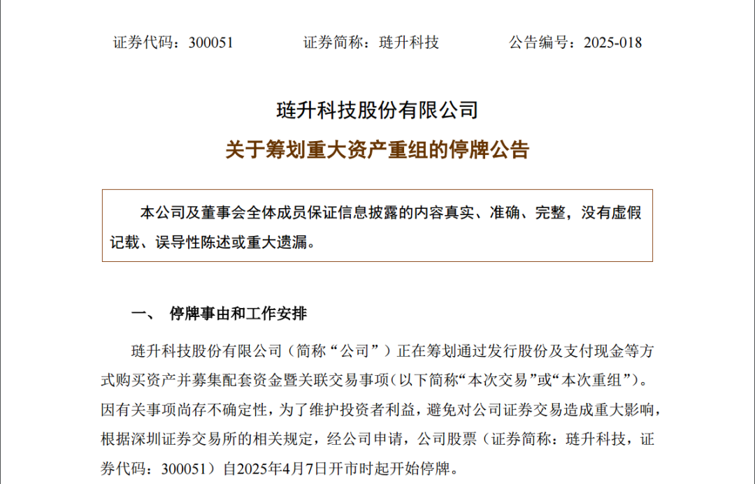 4月7日晚间,琏升科技公告称,公司正在筹划通过发行股份及支付现金等方式购买资产并募集配套资金暨关联交易事项,预计构成重大资产重组。
