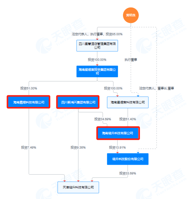 股权穿透可见,四川新鸿兴集团有限公司持有海南琏升科技有限公司(以下简称海南琏升)34.69%的股权,而后者是琏升科技的控股股东。