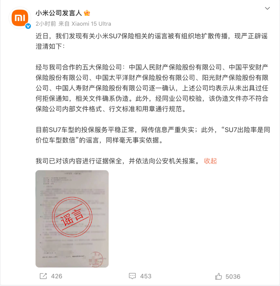 针对网络流传的小米车型拒保相关传言,小米称:经与我司合作的五大保险公司:中国人民财产保险股份有限公司、中国平安财产保险股份有限公司、中国太平洋财产保险股份有限公司、阳光财产保险股份有限公司、中国人寿财产保险股份有限公司逐一确认,上述公司均表示从未出具过任何拒保通知,相关文件确系伪造。此外,经同业公司校验,该伪造文件亦不符合保险公司内部文件格式、行文标准和用章通行规范。
