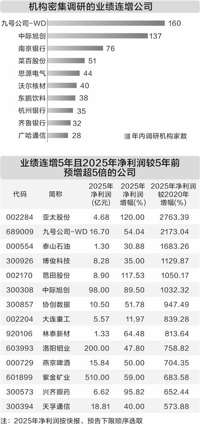 从2025年净利润较5年前的变动幅度来看,50家公司净利润实现翻倍,14家公司净利润增长超5倍,6家增长幅度超过10倍,包括亚太股份、九号公司-WD、泰山石油、博俊科技、芭田股份、中际旭创。