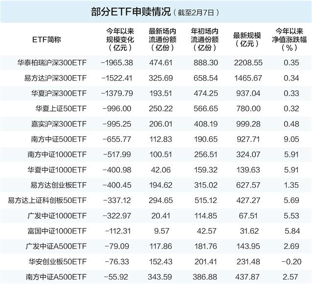 值得关注的是,宽基ETF年初以来的规模收缩主要源于份额赎回,而非市场下跌。数据显示,截至2月6日股票型ETF平均涨幅3.59%,净流出超百亿元的12只ETF开年以来均录得正收益。