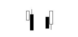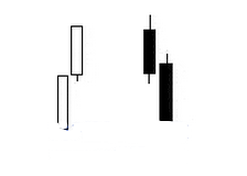 (6) 如图。左图一根阴线吞没一根阳线,空方显示了力量和决心,但收效不大,多方没有伤元气,可以随时发动进攻。图与左图刚好相反,多方进攻了,但效果不大,空方还有相当实力。同样,第二根及线的上下影线的长度也是很重要的。