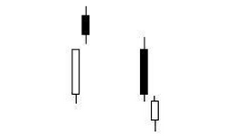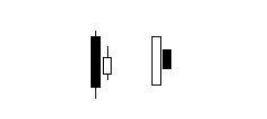 (7) 如图,左图为一根阴线后的小阳线,说明多方抵了,但力量相当弱,很不起眼,空方将发起新一轮攻势。右图号左图正好相反,空方弱,多方将发起进攻,创新高。